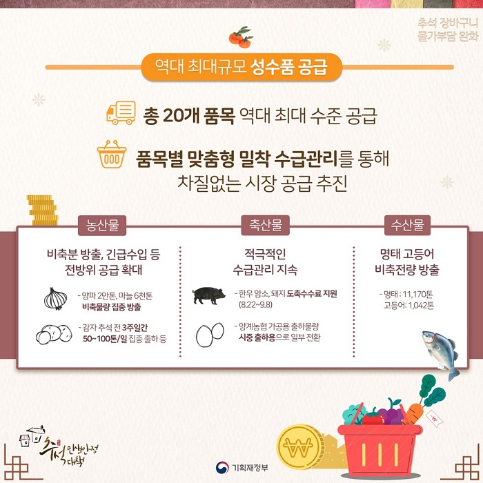 올해 추석 기간 중 20대 성수품 가격을 현재 수준보다 낮춰 지난해 명절 수준(현재 수준보다 7.1% 저렴)으로 관리하겠다는 내용을 포함하고 있습니다. 정부는 정부차원의 지원과 함께 유통업체의 자체 할인 행사를 유도해 할인율을 높이겠다는 계획입니다.
