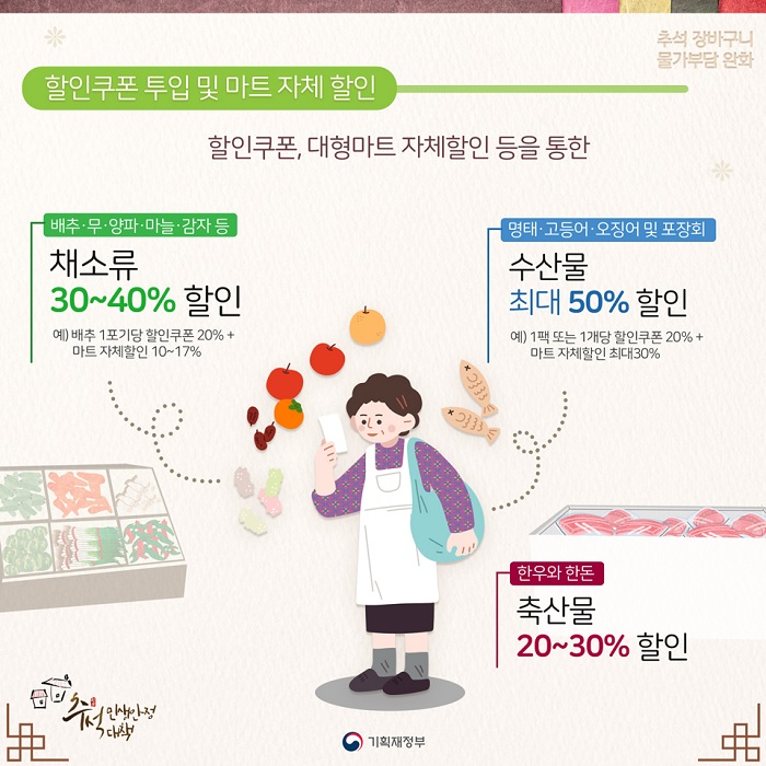 농산물 할인쿠폰은 대형마트·농협 자체할인 등을 통해 할인율을 높일 예정입니다.
