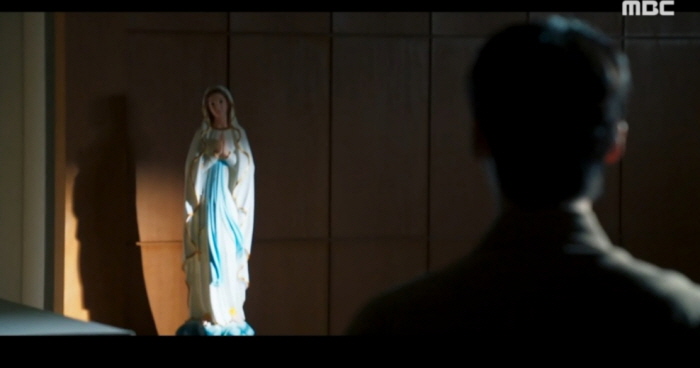 수감자 서열 1위였던 사슬파 두목 양춘식과 빅마우스(처럼 연기하는) 박창호는 서열다툼을 하는 듯 보였으나 둘이 짜고 치는 고스톱이었네요. 양춘식은 공지훈에게 지시받은 거처럼 한재범을 무섭게 위협하고 박창호는 양춘식 손에서 한재범을 보호하는 척 합니다. 한재범의 입을 열게 하기 위해 고해소의 성모마리아 상을 깨기도 합니다.