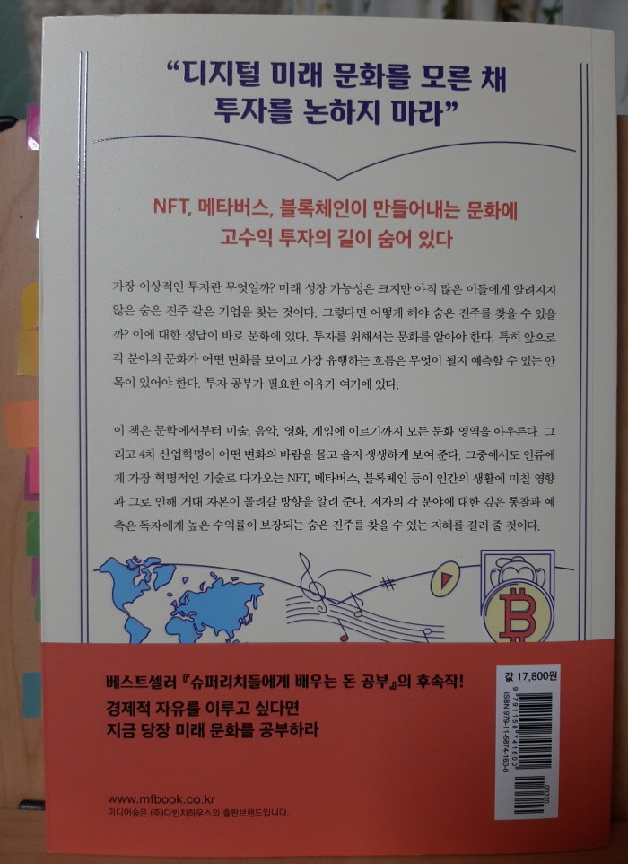 ‘미래 성장 가능성은 크지만, 아직 많은 이들에게 알려지지 않은 숨은 진주 같은 기업’은 어떻게 찾을 수 있을까요? 저자는 ‘미래 문화의 흐름을 잘 파악하면 된다’고 답합니다. 문학, 미술, 음악, 영화, 게임 등 모든 문화 영역에 대한 저자의 통찰과 혜안을 들여다 볼 수 있어서 무척 재미있게 읽었습니다.