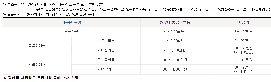배우자나 부양자녀 및 70세 이상 직계존속이 있고 신청자와 배우자가 소득자인 가구입니다. 부양자녀와 직계존속의 연 소득액이 각각 100만원 이하여야합니다. 신청인과 배우자의 총소득금액이 연간 3800만원 미만이면 다른 조건을 고려해 최대 300만원이 지급됩니다.