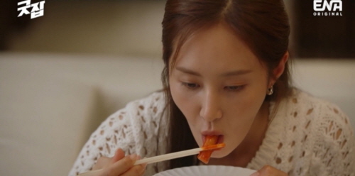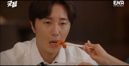홍실장은 숨어서 맞선 자리를 지켜보고 있었고 홍실장을 발견한 은선우와 돈세라는 더 이상 맞선으로 시달리지 않기 위해 연기하기로 합니다. 둘이 함께 스위트룸으로 올라간 것이죠. 돈세라는 최애 음식 떡볶이를 시킵니다. 돈세라, 정말 맛있게 먹더군요! 권유리, 떡볶이 먹는 연기가 굿잡 통틀어서 최고입니다. 두 번째는 술 취해서 아스팔트와 나무에게 말하는 장면이었고요.