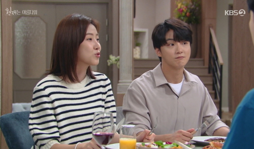 이윤재는 임신으로 붇는 심해준의 다리를 마사지 해줍니다. 자세를 고쳐 잡다가 심해준이 발로 이윤재의 눈 옆을 걷어차게 되지요. 일상이 시트콤인 부부, 이윤재는 눈 주위가 멍들어 ‘맞고 사는 남편’으로 코믹한 화재거리가 됩니다. 진짜 맞고 사는 남편이나 아내가 있다면 반드시 헤쳐 나와야겠지요!