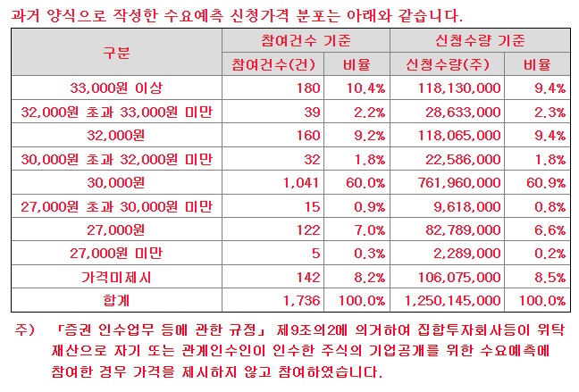 국내외 기관 투자자 수요예측 참여 건수 1,736건에 수량은 1,250,145,000 이 몰려 경쟁률 1,725.78을 기록했습니다.