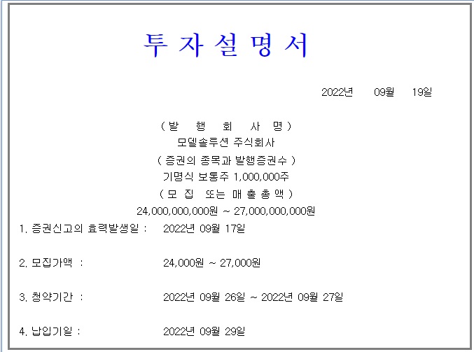 * 모델솔루션 공모주 수요예측일 : 2022. 9. 19.(월) - 9. 20.(화)