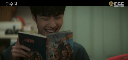 집에서 만화책을 보며 낄껄거리는 황태용.