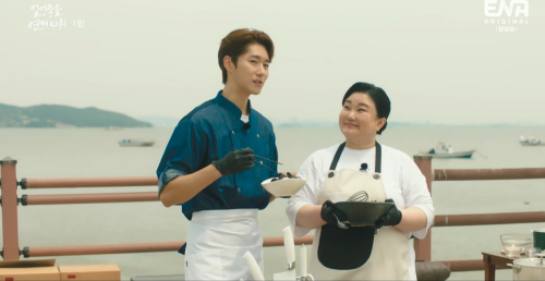‘라면 셰프’의 ‘간장 라면’ 촬영 중 존 장의 목걸이가 간장 독에 빠치는 사고가 일어났고 구여름이 건져내서 돌려줍니다. 존 장이 고맙다며 자기 차를 타고 함께 가자고 합니다. 구여름은 간장에 해가 갈까봐 건져낸 거라며 자신은 그렇게 쿨하지 못하다고 누나, 누나 하지 말고 일로 만난 사이로 지내자고 합니다.