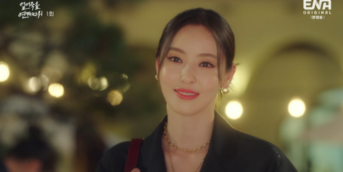 얼어죽을 연애따위 1회 첫 장면. 진한 화장과 올 블랙으로 착장한 구여름이 차량 이동 중 ‘사랑의 왕국 시즌 2’ 정보를 검색중입니다.