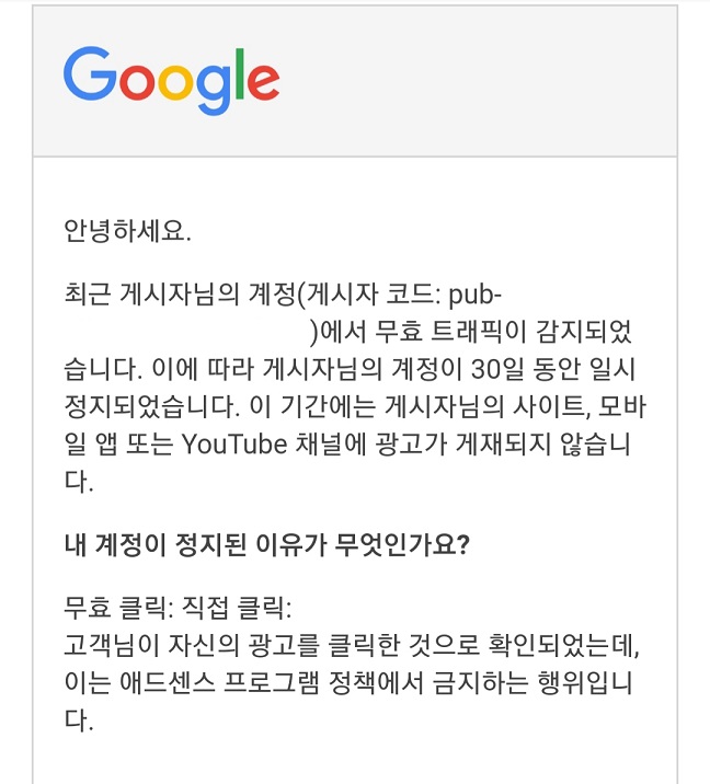 오늘 애드센스 광고 30일 정지 메일을 받았다.