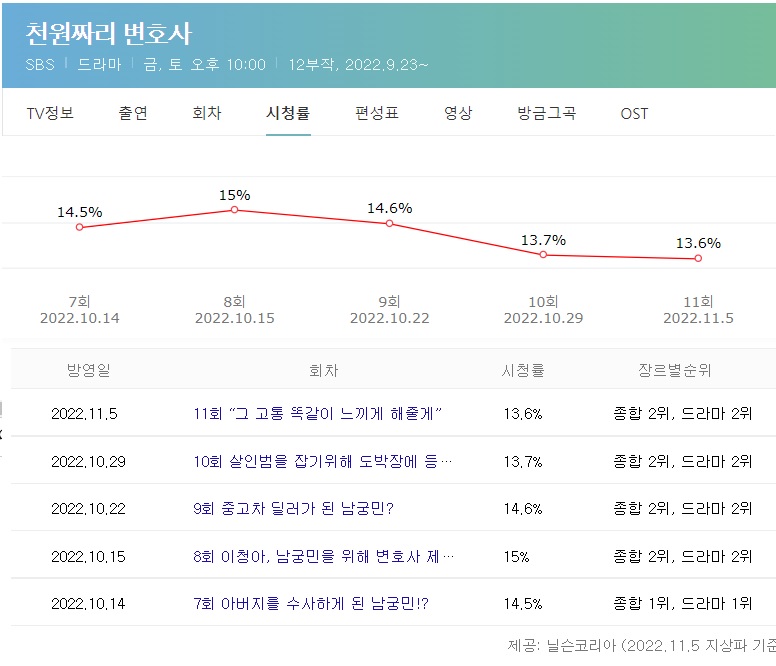 천원짜리 변호사 시청률은 11회 기준 전국 13.6%(수도권 14.4%, 닐슨 코리아)를 기록했습니다. 시청률 그래프는 아래와 같습니다.