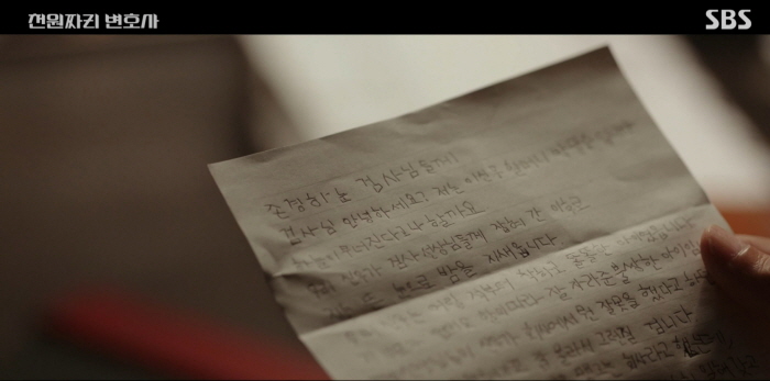 시골마을을 떠날 때 마을 할머니가 천지훈에게 탄원서 묶음을 줍니다. JQ화학에서 근무하는 손자가 억울하게 수감됐다는 탄원서입니다. 변호사 수임이 아닌 무료 법률 상담만 하려던 천지훈은 할머니의 탄원서가 심상치 않음을 알고 수사를 하고자 법원에 갔다가 백마리에게 딱 걸립니다.
