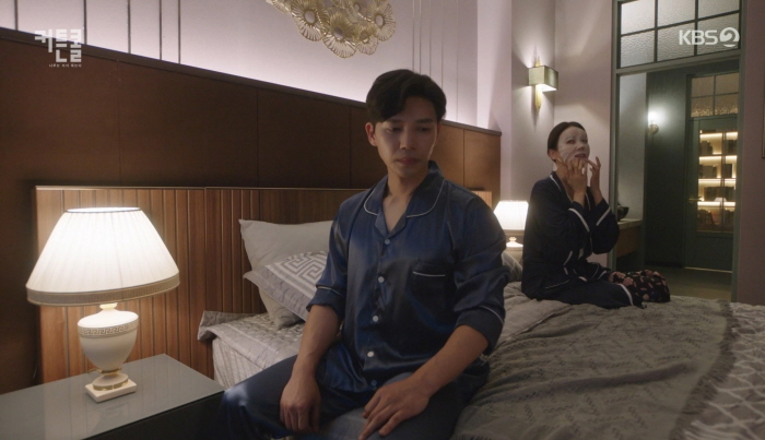 유재헌을 짝사랑하는 서윤희는 가짜 부부 역할을 하는 지금이 찬스입니다. 소파에서 자려는 유재헌에게 의심 받을 짓 하지 말라며 한 침대에서 자자고 합니다. 유재헌은 쭈뼛거리며 침대로 들어가 “잘 자.”라는 인사를 남기고 잠이 듭니다. 오! 자제력이 대단하네요.