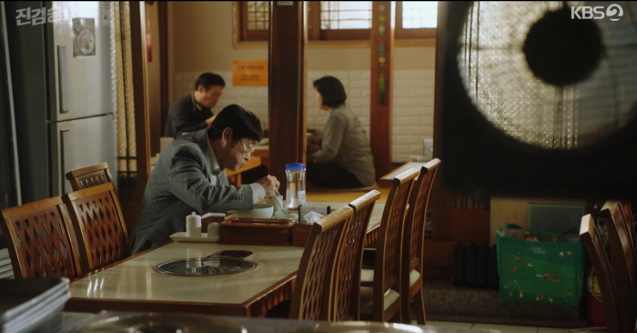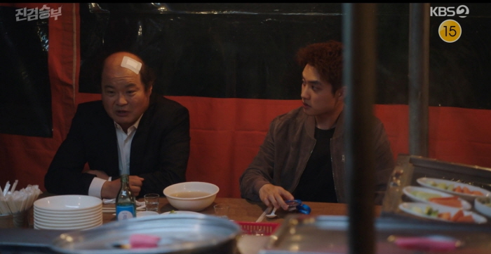 느긋하게 국수를 먹고 있는 서현규 앞에 진정이 나타납니다.