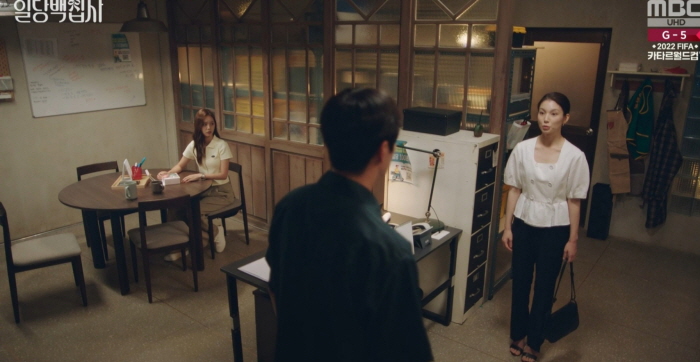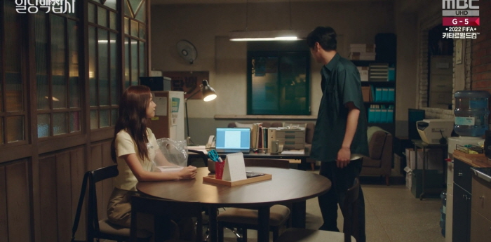 임일섭은 시골 밤길이라 위험하다며 일당백 심부름센터 사장이 올 거라고 하지요. 그러나 사장 빈센트가 아닌 직원 김태희가 옵니다. 백동주와 김태희는 고인의 집에서 사진을 찾아 스마트폰으로 전송합니다. 태희는 서랍속의 도라지 담배를 챙겨 급식에게 주라고 합니다.