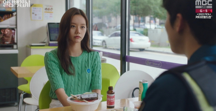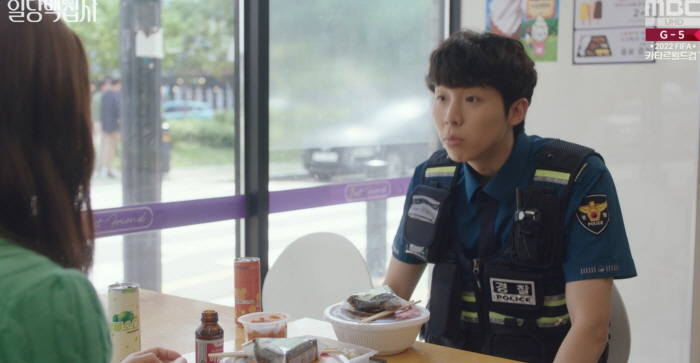 마침 봉수지구대 순경 서해안이 백동주에게 점심을 먹자고 문자합니다. 편의점에서 컵라면과 삼각 김밥을 앞에 두고 앉은 두 사람. 서해안은 백동주를 무척 좋아하는데요. 동주가 이 감정을 알고 있다면 서해안에게 곁을 주면서 희망고문을 해서는 안 되는 거겠죠.
