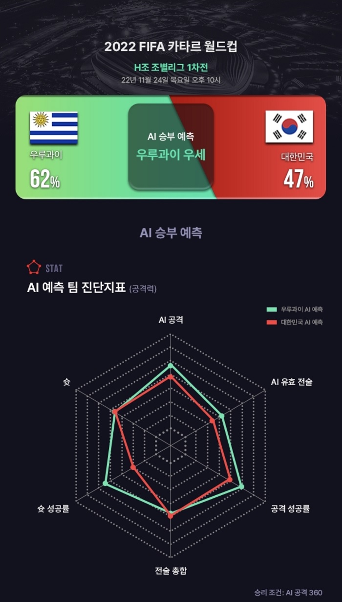KBS my K 앱에서는 에임브로드(실시간 디지털 축구 엔터테인먼트 솔루션 업체)와 협업하여 ‘축구 AI’가 자체 분석한 월드컵 예측 결과를 제공하고 있습니다. H조 조별리그 대한민국과 우루과이 경기에서 대한민국이 승리할 확률 47%, 우루과이가 승리할 확률 62%로 예측했습니다.