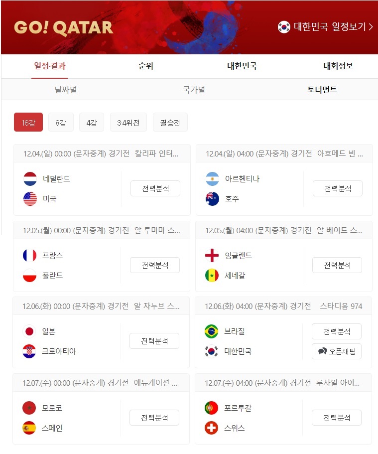 세계인의 축제 카타르 월드컵 조별 리그가 막바지에 접어들었습니다. 우리 대한민국은 피파 랭킹 9위인 포르투칼과 조별리그 3차전을 앞두고 있습니다. 카타르 월드컵 대한민국 대 포르투칼 경기는 12월 3일 토요일 0시에 중계될 예정입니다. 12월 2일 현재 16강전 여덟 경기 중 여섯 경기의 대진표가 발표되었습니다. 나머지 두 경기는 G조와 H조의 조별 리그가 끝난 후에 확정됩니다.