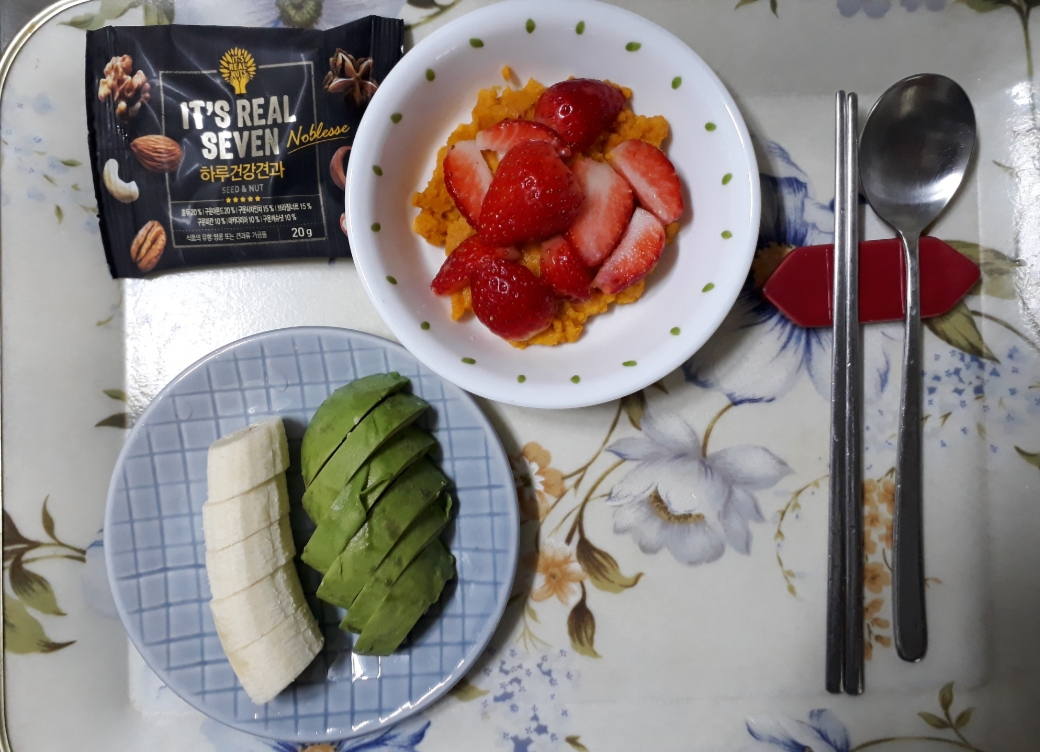 점심 : 아보카도, 바나나, 매쉬드 단호박&딸기, 견과류