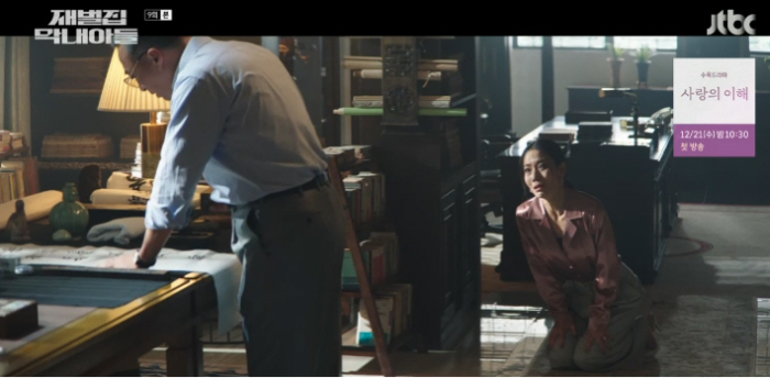 진동기는 진화영에게 순양 백화점과 공금 횡령에 대한 지라시가 돌고 있다고 알려줍니다. 진화영은 그제야 모든 게 진도준의 모략이었음을 파악합니다. 진화영은 아버지 진양철을 찾아가 무릎까지 꿇으며 도와달라고 애원합니다.