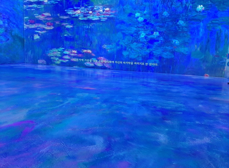 모네 인사이드 미디어 아트는 매시간 시작한다. 35분 정도 미디어 아트를 감상하고 15분 정도 자유 사진 촬영 시간을 준다. 전시회장 사면 벽과 바닥까지 모네 그림 영상으로 가득차자 살짝 전율이 일었다. 모네 그림 속에 오롯이 들어 온 느낌.