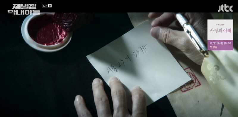 심화랑에 찾아간 진도준의 비서는 낙관에 대해 알게 됩니다. 진양철이 탄 자동차 번호를 적은 쪽지 뒷면에 우연히 묻은 낙관 일부를 단서로 범인을 찾아냅니다. 바로 진양철의 아내 이필옥이 범인이었죠.