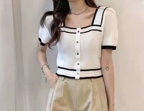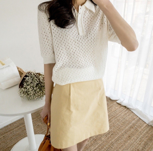 흰색 상의에 연갈색 하의는 단정하고 조신한 느낌이다. 가끔 슬리브리스 블라우스로 분위기를 전환하는 것도 좋다.