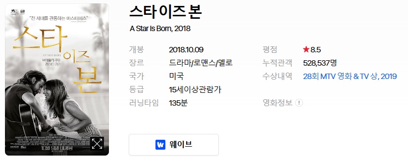 '노래에 놀라운 재능을 가졌지만 외모에는 자신이 없는 무명가수 앨리(레이디 가가 분)는 공연을 하던 바에서 우연히 톱스타 잭슨 메인(브래들리 쿠퍼 분)을 만나게 됩니다. 자신의 모든 것을 사랑해주는 잭슨의 도움으로 앨리는 자기 안의 열정을 폭발시키며 최고의 스타로 거듭납니다. 그러나 잭슨은 어린 시절의 상처와 예술가로서의 고뇌 속에서 점점 무너져가는데…'