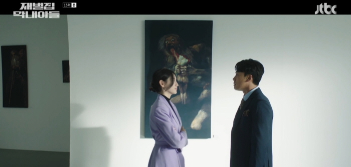진성준의 아내 모현민은 고야의 그림인 ‘아들을 잡아먹는 크로노스(사투루누스)’를 보여줍니다. 진성준은 자신이 아버지에게 잡아먹히는 걸 비웃냐며 화를 내지만 모현민은 크로노스는 아버지 우라노스를 죽였다고 말해줍니다.