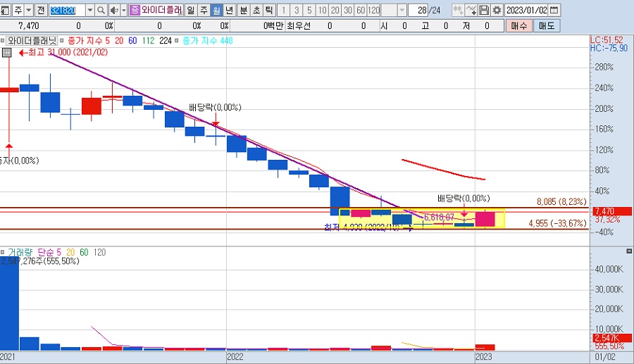 와이더플래닛 월봉을 보면 21년 이후 음봉으로 쭉 우하향하던 주가가 22년 7월 양봉으로 브레이크를 잡고 박스권으로 횡보합니다. 2023년 1월에 3개월간 횡보 박스를 뚫는 양봉이 섰지만 7470원 저항구간에 부딪힌 걸 알 수 있습니다.