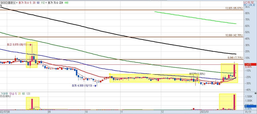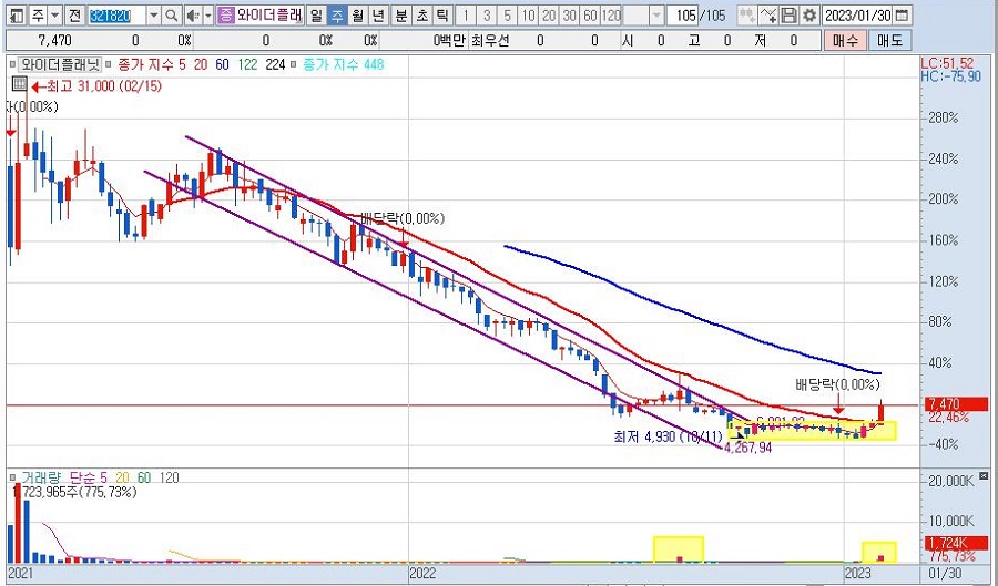주식 투자자들이 기다리던 2022년 산타랠리는 오지 않았습니다. 많은 전문가들이 2023년 대침체를 예상하는 가운데 2023년 1월 베어마켓랠리가 펼쳐졌습니다. 제가 좋아하는 매수타점은 1년 장기 이평선 밑에서 이격이 벌어진 역배열 상태였던 종목이 1년 이평선을 뚫고 턴어라운드 하는 시점입니다. 와이더플래닛도 그런 종목 중 하나입니다.