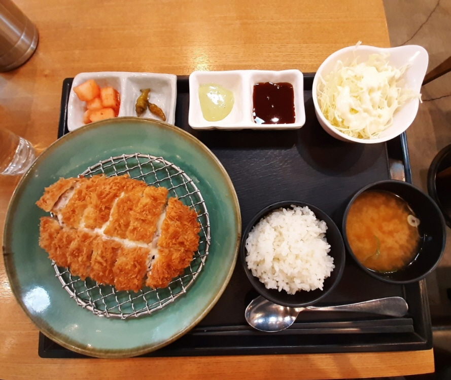 오후 1시, 18시간 공복 후(저녁 7시~다음날 정오까지 간헌절 단식 중)에 먹는 고소한 돈까스의 맛은 말해 뭐해. 겉은 바삭하고 속은 촉촉하고 치즈는 쭈욱 늘어나고. 두 종류의 소스가 있었다. 전형적인 갈색 돈까스 소스와 고추냉이로 맛을 낸 연초록색 소스. 연초록색 소스가 정말 맛있었다. 여느 집보다 다서 짠 미소 된장국과 쌀밥(보통 공기밥의 반 정도)과 깍두기, 할라피뇨 고추 장아찌, 양배추 샐러드가 나왔다.