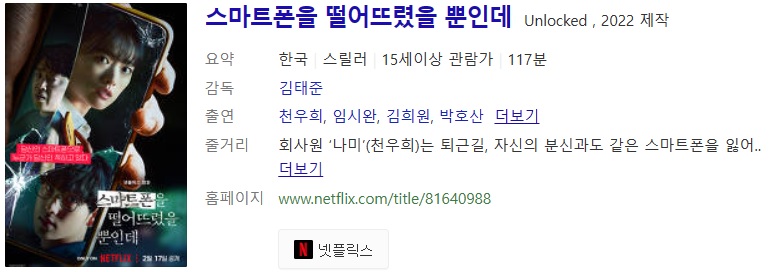 스마트폰을 떨어뜨렸을 뿐인데 원작은 일본 작가 ‘시가 아키라’의 동명 소설입니다. 일본에서도 영화로 제작되어 2018년 공개된 적 있습니다. 수십 년 전 빌 게이츠가 손바닥 크기의 휴대용 컴퓨터를 가지게 될 것이라고 했을 때, ‘어느 세월에~’라고 생각했던 적이 있습니다. 이제 손 안의 컴퓨터 스마트폰은 대다수의 필수품이 되었죠. 김태준 감독이 각본까지 맡았습니다. 넷플릭스 오리지널 영화로 2023년 2월 17일에 공개되었고 스트리밍 역시 넷플릭스에서만 제공합니다. 상영시간 117분, 15세 이상 관람가입니다.