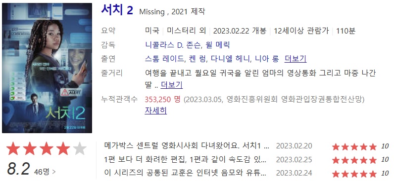영화 서치는 2018년 개봉해서 295만 여명의 관객을 동원했습니다. 유독 한국에서 흥행에 성공한 영화인데요. 서치2가 지난 2월 22일 개봉했습니다. ‘속편은 전편보다 못하다’는 평가가 많은데 서치2는 전편 못지않은 스릴과 반전이 있었습니다. 서치2 결말 해석 출연진 줄거리에 대해 알아봅니다.