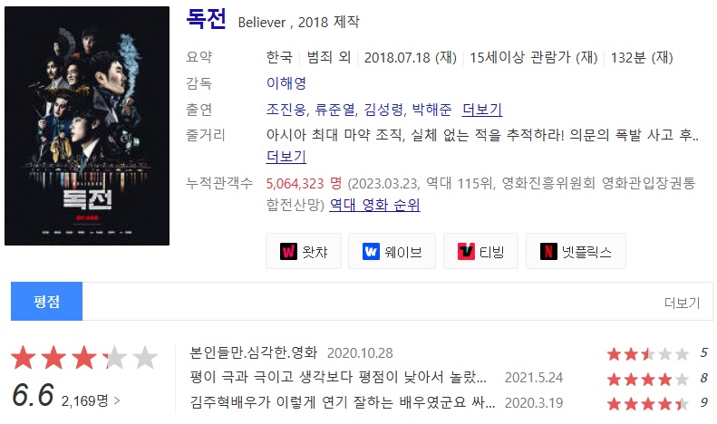 전반부 강렬한 도입과 빠른 사건 전개에 비해 후반부에 늘어진다는 평이 있었는데 저는 넷플릭스 1.5배속으로 시청해서 그런지 늘어지는 느낌은 별로 없었습니다. 독전 극장판에서 열린 결말로 끝나고 총을 쏜 자가 누군지 몰랐다면 아무리 독전2가 제작된다고 해도 황당했을 거 같습니다.
