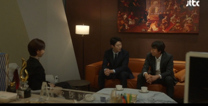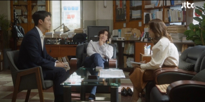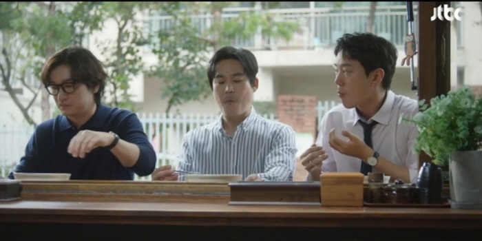 신성한과 사무장 장형근(김성균 분), 인턴 변호사 최준(한은성 분)은 라면집에 앉아 금화로펌에 대해 이야기합니다.