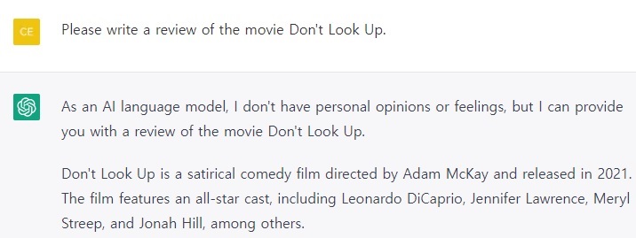 영화 돈룩업은 레오나르도 디카프리오, 제니퍼 로렌스 주연의 풍자 코미디 영화입니다. 요즘 핫한 오프AI의 챗GPT에 ‘Please write a review of the movie Don't Look Up.’이라고 입력했더니 ‘AI 언어 모델로서 개인적인 의견이나 느낌은 없지만, 영화 Don't Look Up에 대한 리뷰를 제공할 수 있습니다.’라며 제법 그럴듯한 답변을 내 놓았습니다. 제가 직업 작성한 영화 돈룩업 결말 뜻 리뷰와 함께 챗GPT의 리뷰입니다.