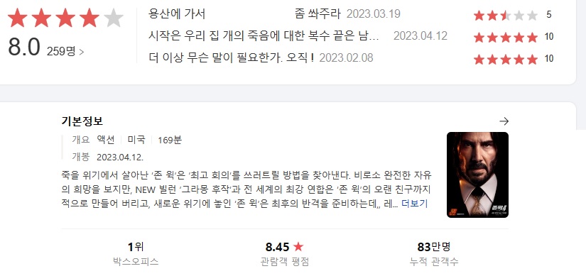 다음 영화에서 존윅4 평점은 8.0, 네이버 영화에서 8.45를 기록 중입니다.
