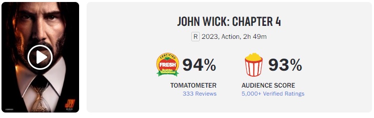 존윅4 평점은 로튼토마토 신선지수 94%, 관객평점 93%로 높은 점수를 받았습니다.