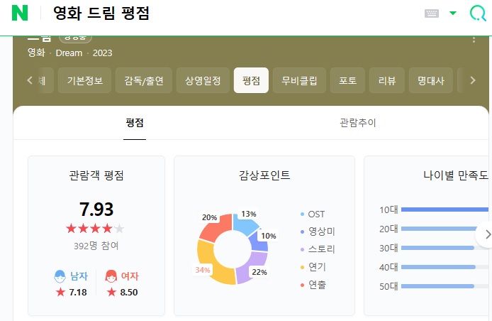 영화드림 평점은 네이버 영화에서 7.93점입니다. 네이버 평점에는 평론가 한 줄 평도 있어서 소개해 봅니다. 10점 만점입니다.