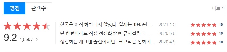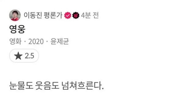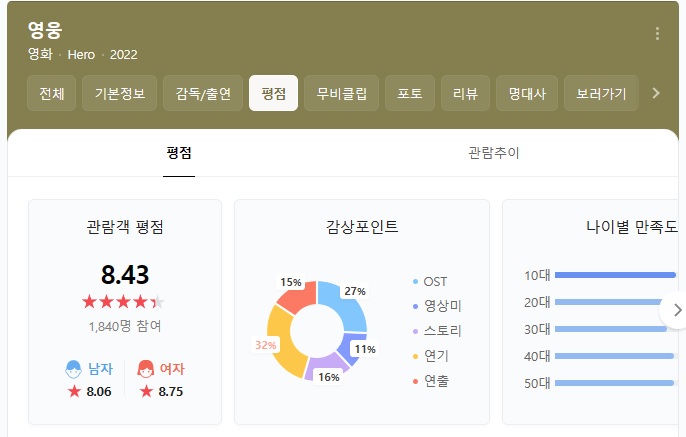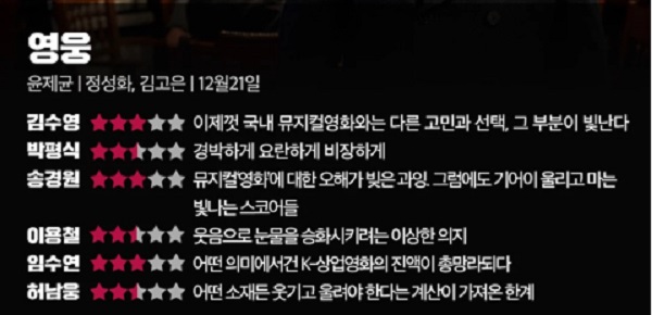 관객들의 영웅 평점은 역대급으로 높다. 다음 영화 평점은 9.2점, 네이버 영화 평점은 8.43점이다. 이제 영화 평론가의 평점을 보자.