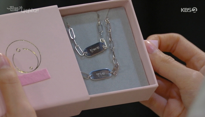 오연두는 공태경이 친정 조카 수겸에게 좋은 선물을 준 것에 고마움을 표합니다. 진짜가 나타났다 13회 줄거리에서 태경은 연두의 생일 선물로 미아방지용 산모와 아기 팔찌를 선물합니다. '연두'와 '진짜'라는 각인도 돼 있네요.