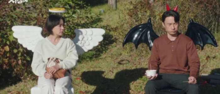 의료 봉사를 마치고 귀가하는 길, 휴게소에 들른 병원 사람들. 로이 킴은 차정숙에게 커피를 건네고 차정숙은 커피 감사하다며 혼자 조금 더 걷겠다고 합니다. 서인호는 혼자 걷고 있는 차정숙에게 알감자를 내밀지만 정숙은 거절합니다. 앉아 있는 의자가 천사와 악마라는 설정에서 작가의 유머가 느껴집니다.