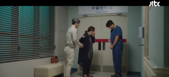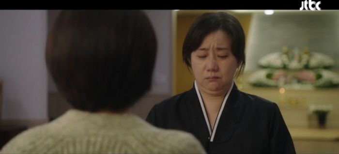 차정숙은 운동화도 짝짝이로 신은 채 장례식장 유족에게 찾아가 고인이 된 산모의 어머니를 안고 통곡합니다.