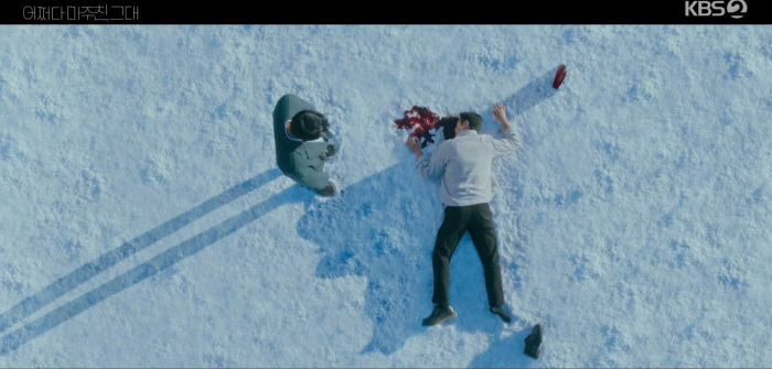 해준은 타임머신을 타고 자신이 살해당한 현장에 갑니다. 눈 밭 위에 피를 흘리며 쓰러져 있었죠.