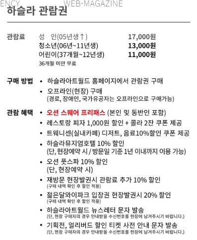 하슬라 아트월드 입장권은 홈페이지에서 예매하거나 현장에서 구매할 수 있습니다. 홈페이지에 명시된 입장료는 아래와 같습니다. 성인이 17,000원입니다.