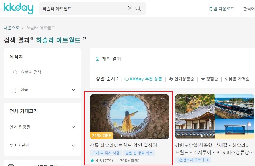 kkday 검색창에 ‘하슬라 아트월드’를 검색하면 아래 화면과 같은 메뉴가 뜹니다. 입장료가 21% 할인됩니다.
