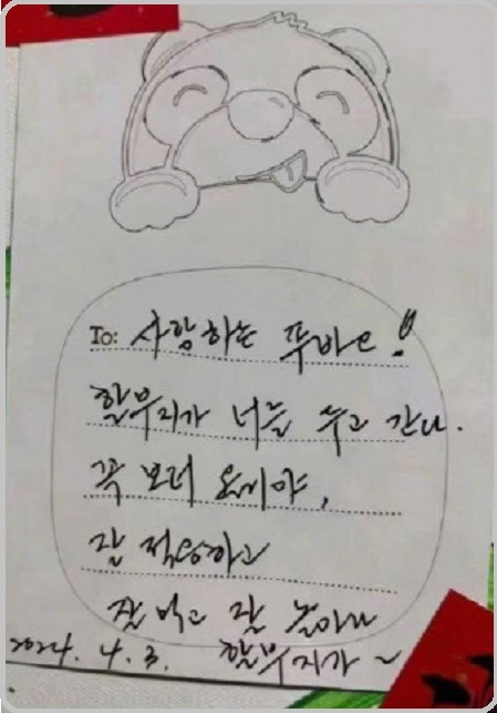 강철원 사육사님이 중국에 푸바오를 남겨두고 오시기 전 친필 엽서를 남겼다. 또 눈물이 또르르 흘렀다. ‘할부지가 너를 두고 간다.’는 말에 함축된 감정이 절절하게 다가왔다. “(2020년 7월 20일, 197g의 네가 태어나는 순간부터 피붙이처럼 애지중지 돌본) 할부지가 (두려움을 느끼며 낯선 곳에서 혼자 적응해야하는) 너를 두고 (차마 떨어지지 않는 발걸음을 돌려 한국으로) 간다......”