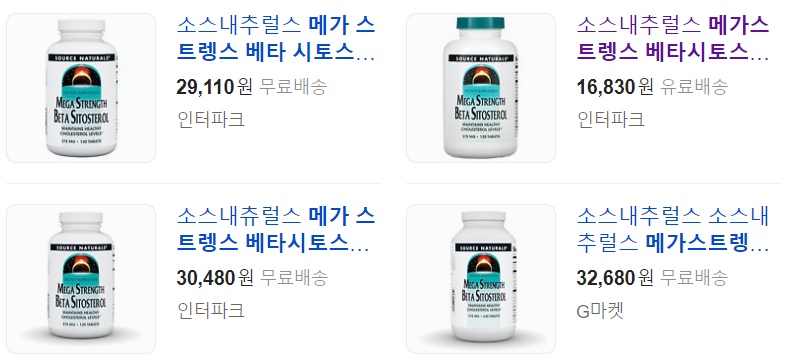 소스 네츄럴스의 메가 스트렝스 베타 시토스테롤375mg로 검색해보면 가격도 천차만별 배송비도 천차만별이니까 잘 비교해 보고 구입하시기 바랍니다. 배송비가 9500원 ~ 2500원까지 있습니다. 건강은 건강할 때 지키는 우리가 되어보아요^^
