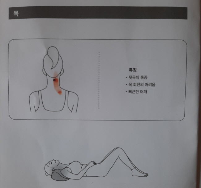 ① 목을 양쪽 측면 지압존 사이에 놓고 중심 지압존에 뒷목을 지긋이 눌러줍니다.
