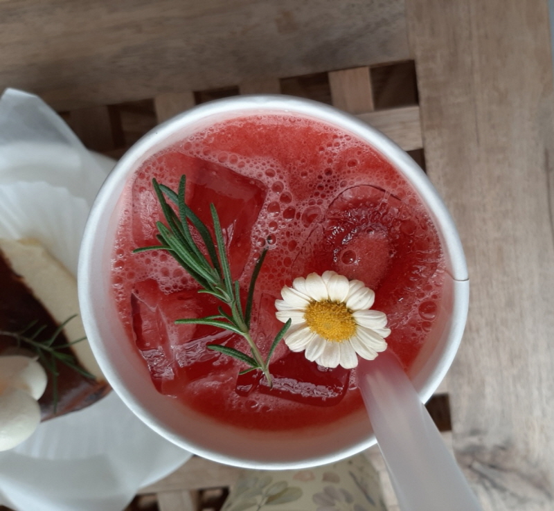 뜨거운 아메리카노, 수박주스, 바스크 치즈케이크를 주문했다. 아메리카노는 강배전 된 원두인 듯 쌉싸름하게 진했고 수박주스는 수박 과육을 갈아서 상큼했다. 바스크 치즈케이크는 계란의 비린 맛 없이 고소하고 부드러웠다.
